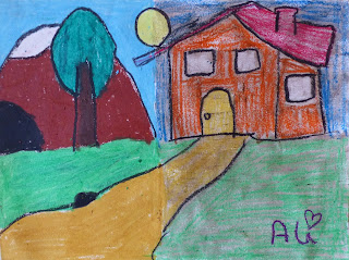 Primero se han pintado estos dibujos con ceras de colores, sin saturar el papel de color para pasar por encima un pincel de nogalina. Las ceras repelen la pintura y los trabajos adquieren un aspecto envejecido.
